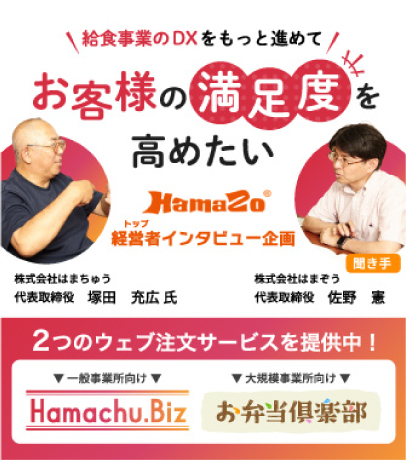 会社ロゴマークを飲み代1回分で近所の商業デザイナーに依頼 有限会社から株式会社へ改組するとともに、登記上も社名を平仮名の「はまちゅう」とする 2500食製造 |